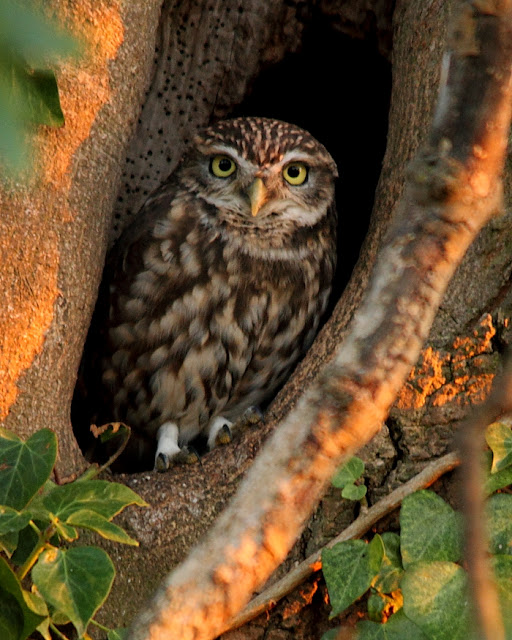 BAD...........I took the time out over the weekend to make several visits to see if the four juvenile little Owls were still hanging around at my site No 87. It is almost certainly bad news now as I just can't relocate them anywhere. I did however locate and photograph the female adult owl sheltering at the entrance to a cavity nearby (below).